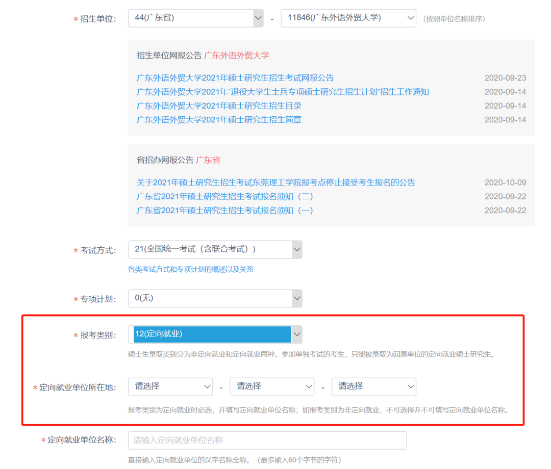 报考类别:全日制可填非定向就业或定向就业(如填写定向就业,将不能参评国家助学金等资助),非全日制必须统一填定向就业(无需单位提供证明),