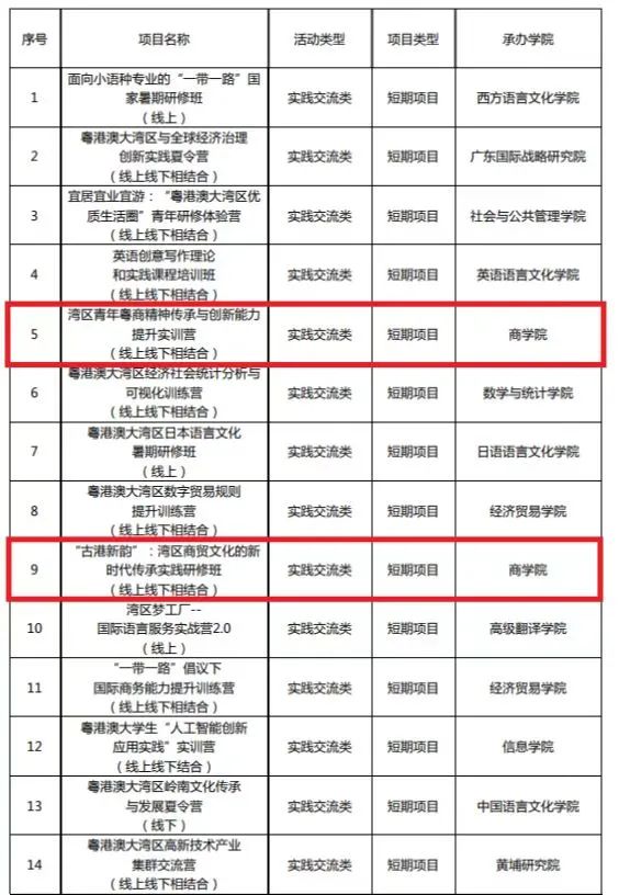 根据教育部港澳台事务办公室《关于2023年港澳与内地大中小学师生交流计划项目的批复》,经专家评审,学校获批立项14项,由商学院与港澳高校合作申报的《湾区青年粤商精神传承与创新能力提升实训营》《“古港新韵”:湾区商贸文化的新时代传承实践研修班》2个项目获立项,立项数居全校各学院首位。