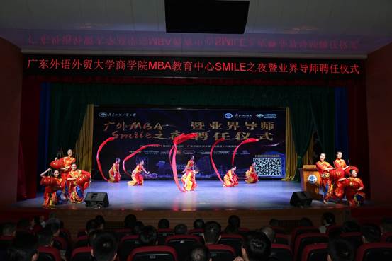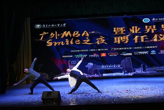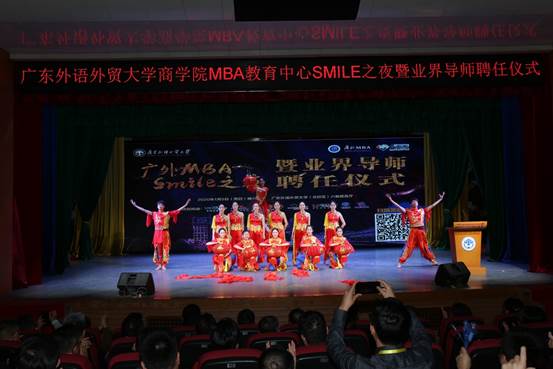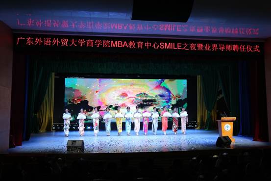 晚会在红红火火的《喜庆欢歌》中拉开帷幕,商学院院长朱文忠教授为本次晚会致辞。他提到,广外MBA始终践行“社会责任(Social Responsibility)、尊重包容(Mutual Respect)、正直诚信(Integrity)、知行合一(Learning by Doing)、创业精神(Entrepreneurship)”的“SMILE”价值观,在学校领导及社会各界的大力支持下,通过了AMBA国际认证和再认证,而这几年成就的取得,离不开每位领导、老师和同学的不懈努力。双导师制的施行必将为广外MBA教育注入更多活力,广外MBA定会在各界人士的支持下变得更强大、更优秀。