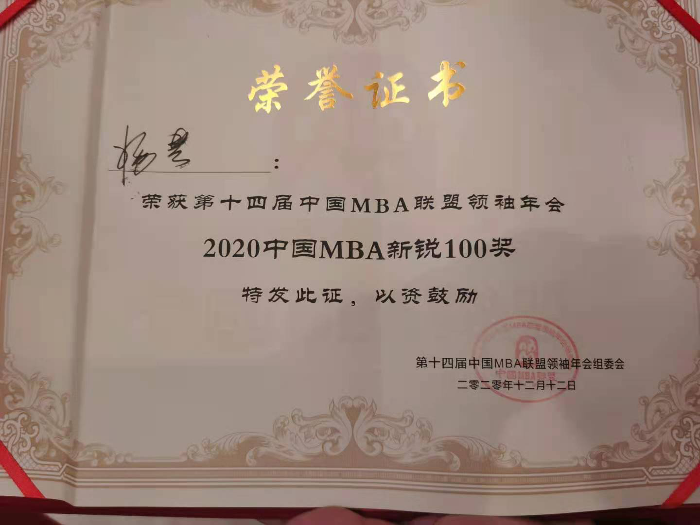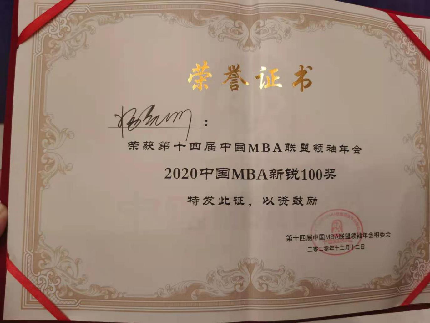 其中,2020级新生杨慧、杨凯川荣获第十四届中国MBA联盟领袖年会“2020中国MBA新锐100奖”,2019级胡冰娴同学荣获“2020中国MBA优秀干部”荣誉称号。