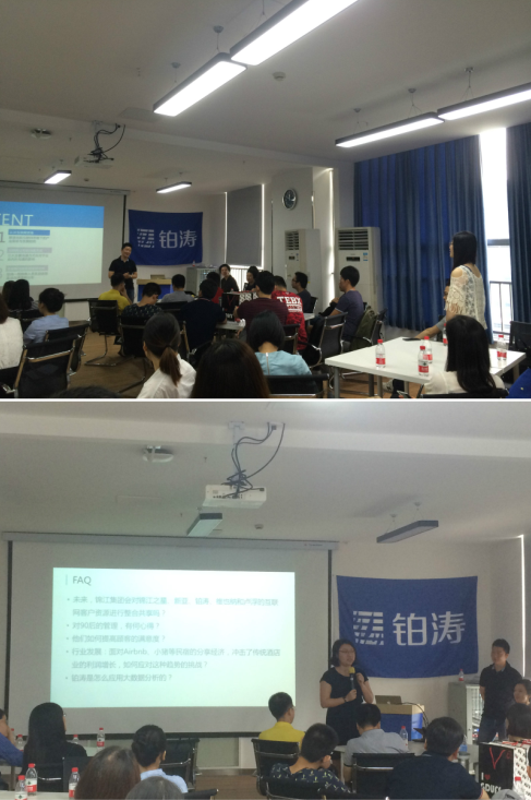 上午九点,贾佳老师和同学们准时抵达了铂涛集团。首先,由铂涛集团互联网公司人力资源高级经理Susan带领大家参观集团一楼大厅和互联网公司办公室。进入铂涛集团的大门,映入眼帘的是大屏幕上铂涛互联网公司对MBA学生到来所表示的热烈欢迎以及铂涛集团旗下各个子品牌的标志。Susan对各个子品牌进行一一介绍。