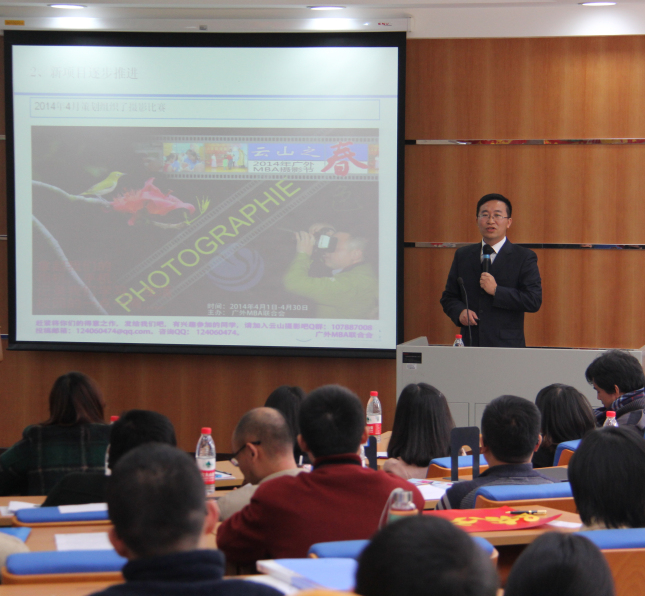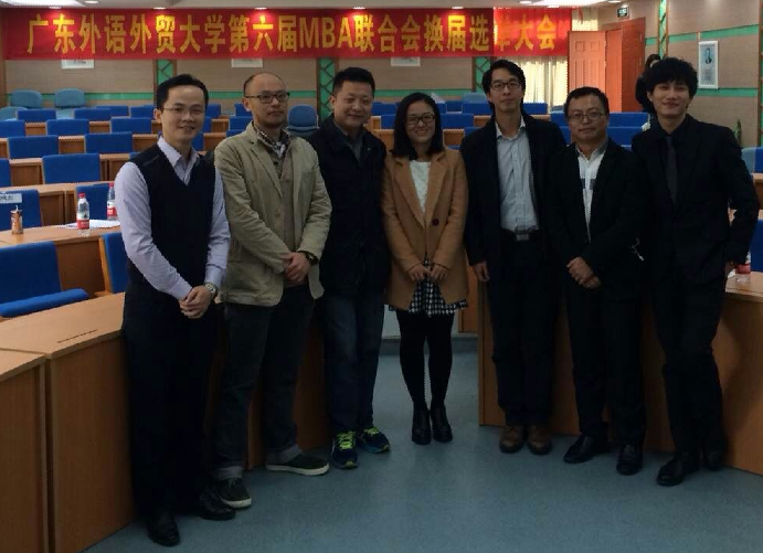 12月14日下午,广外MBA第六届联合会(以下简称“联合会”)换届选举在九教丝纺讲堂进行。商学院副院长袁登华教授、第四届联合会主席徐建军、第五届联合会主席姜福全以及中心老师出席了会议。
