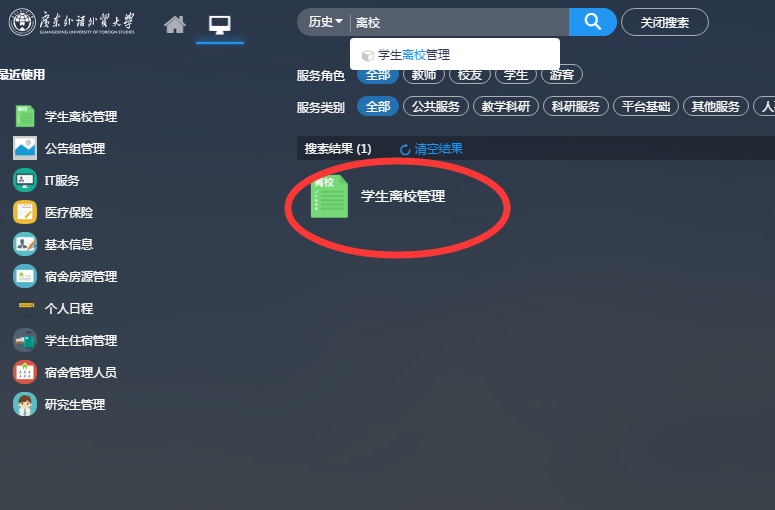 从搜索结果点击“学生离校管理”中进入离校系统。