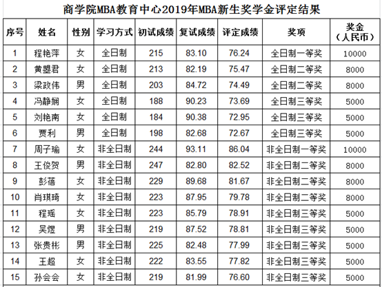 根据《广外商学院MBA奖学金评选办法(2019)》有关要求,经MBA教育中心初评,学院复核、奖学金评审委员会评审、学院党政联席会议审议等程序,共评选出2019年MBA新生奖学金获得者15名。现将名单予以公示。