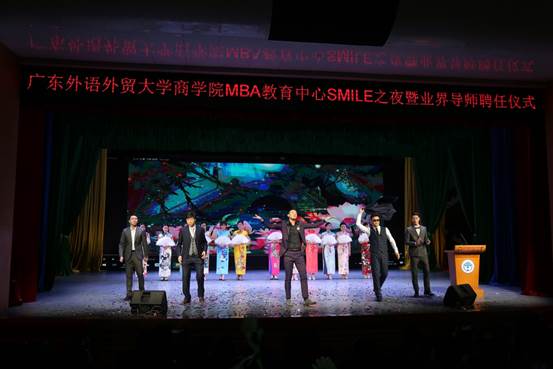 晚会在红红火火的《喜庆欢歌》中拉开帷幕,商学院院长朱文忠教授为本次晚会致辞。他提到,广外MBA始终践行“社会责任(Social Responsibility)、尊重包容(Mutual Respect)、正直诚信(Integrity)、知行合一(Learning by Doing)、创业精神(Entrepreneurship)”的“SMILE”价值观,在学校领导及社会各界的大力支持下,通过了AMBA国际认证和再认证,而这几年成就的取得,离不开每位领导、老师和同学的不懈努力。双导师制的施行必将为广外MBA教育注入更多活力,广外MBA定会在各界人士的支持下变得更强大、更优秀。