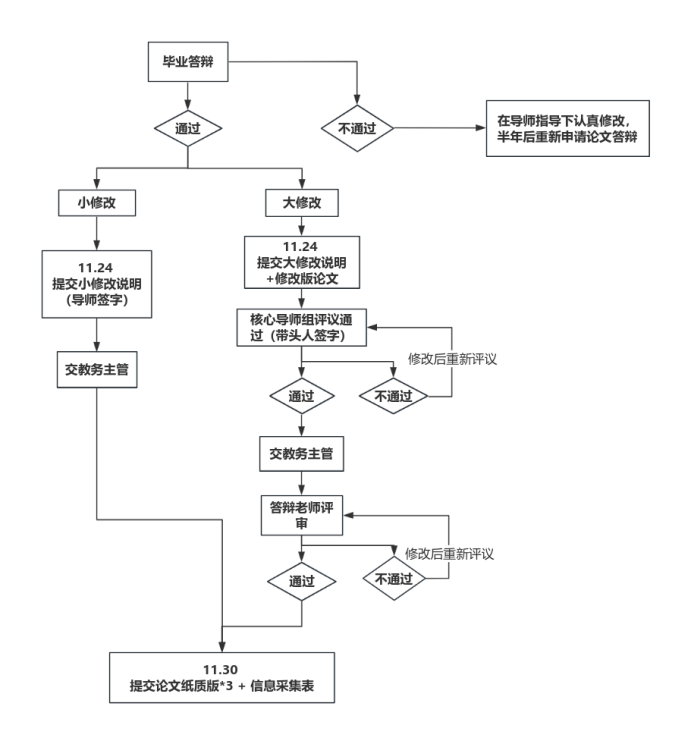 (3)大修改的学生需同时提交修改版论文和大修改说明,并需通过两个环节评审。首先,由相关方向核心导师组进行审议其修改是否达到毕业要求,审议结果为通过的学生,将由课程组主/副带头人在大修改说明签字,并交由教学主管存档;审议结果为未达到毕业要求的学生需重新进行论文修改后再次提交,直至核心导师组审议通过。其次,核心导师组通过的论文和大修改说明交由教学主管发给答辩老师进行再次评审。如果评审结果为通过,则论文修改完成;如果评审结果为不能达到毕业要求,需重新修改论文后重新提交,直至获得答辩委员通过。